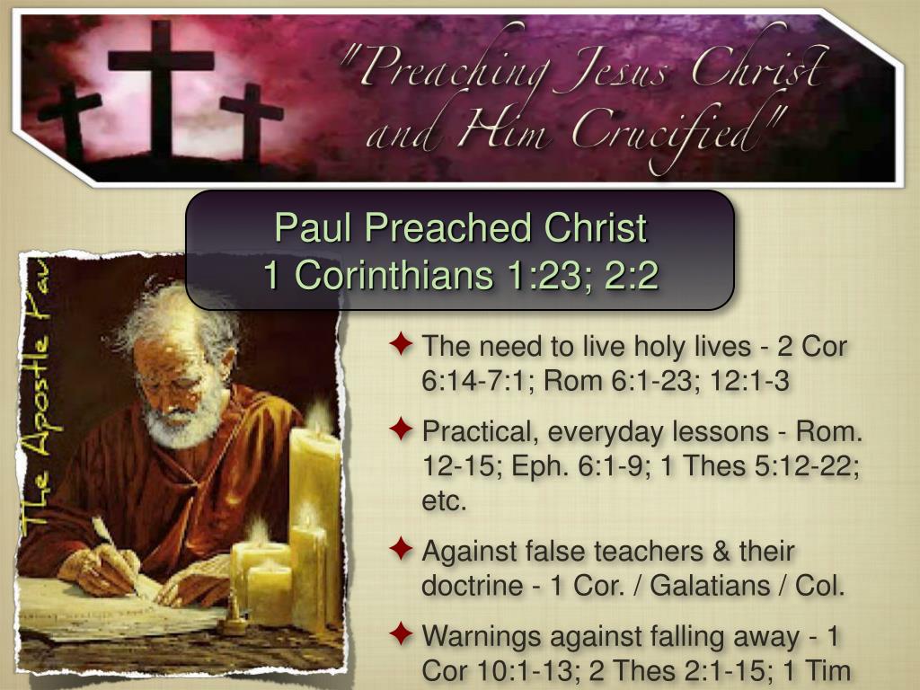 Paul Preached Christ 1 Corinthians 1:23; 2:2 • The need to live holy lives - 2 Cor 6:14-7:1; Rom 6:1-23; 12:1-3 • Practical, everyday lessons - Rom. 12-15; Eph. 6:1-9; 1 Thes 5:12-22; etc. • Against false teachers & their doctrine - 1 Cor. / Galatians / Col. • Warnings against falling away - 1 Cor 10:1-13; 2 Thes 2:1-15; 1 Tim 4:1-5; 2 Tim 3:1-9