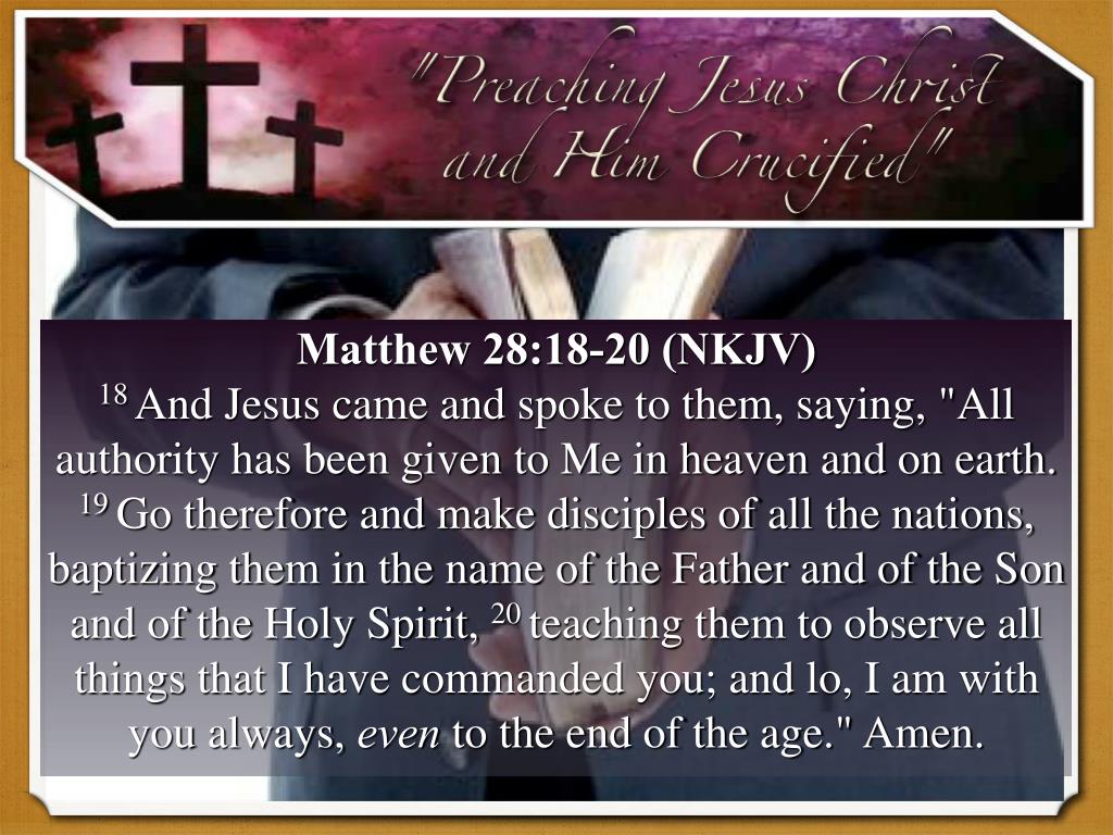 Matthew 28:18-20 (NKJV) 18 And Jesus came and spoke to them, saying, "All authority has been given to Me in heaven and on earth. 19 Go therefore and make disciples of all the nations, baptizing them in the name of the Father and of the Son and of the Holy Spirit, 20 teaching them to observe all things that I have commanded you; and lo, I am with you always, even to the end of the age." Amen.