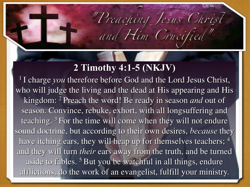 2 Timothy 4:1-5 (NKJV) 1 I charge you therefore before God and the Lord Jesus Christ, who will judge the living and the dead at His appearing and His kingdom: 2 Preach the word! Be ready in season and out of season. Convince, rebuke, exhort, with all longsuffering and teaching. 3 For the time will come when they will not endure sound doctrine, but according to their own desires, because they have itching ears, they will heap up for themselves teachers; 4 and they will turn their ears away from the truth, and be turned aside to fables. 5 But you be watchful in all things, endure afflictions, do the work of an evangelist, fulfill your ministry.