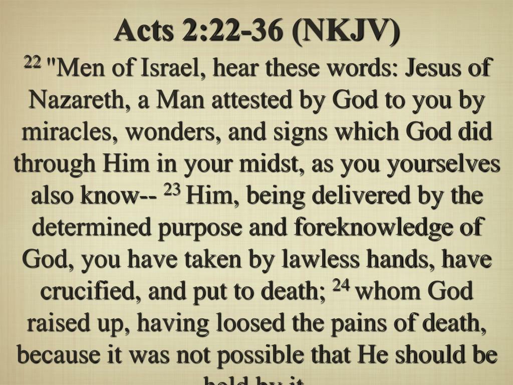Acts 2:22-36 (NKJV) 22 "Men of Israel, hear these words: Jesus of Nazareth, a Man attested by God to you by miracles, wonders, and signs which God did through Him in your midst, as you yourselves also know-- 23 Him, being delivered by the determined purpose and foreknowledge of God, you have taken by lawless hands, have crucified, and put to death; 24 whom God raised up, having loosed the pains of death, because it was not possible that He should be held by it.