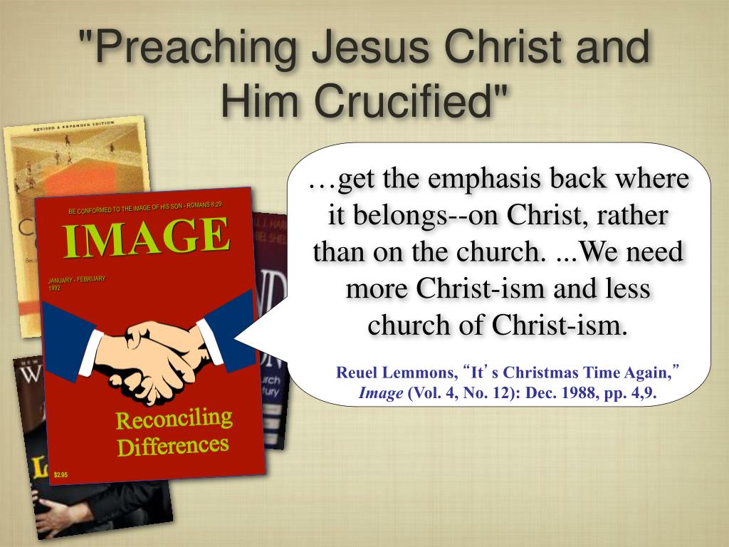 "Preaching Jesus Christ and Him Crucified" …get the emphasis back where it belongs--on Christ, rather than on the church. ...We need more Christ-ism and less church of Christ-ism. Reuel Lemmons, “It’s Christmas Time Again,”Image (Vol. 4, No. 12): Dec. 1988, pp. 4,9.