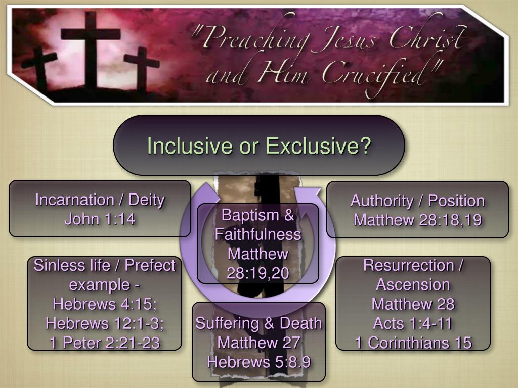 Inclusive or Exclusive? Incarnation / Deity John 1:14 Authority / Position Matthew 28:18,19 Baptism & Faithfulness Matthew 28:19,20 Sinless life / Prefect example - Hebrews 4:15; Hebrews 12:1-3; 1 Peter 2:21-23 Resurrection / Ascension Matthew 28 Acts 1:4-11 1 Corinthians 15 Suffering & Death Matthew 27 Hebrews 5:8.9