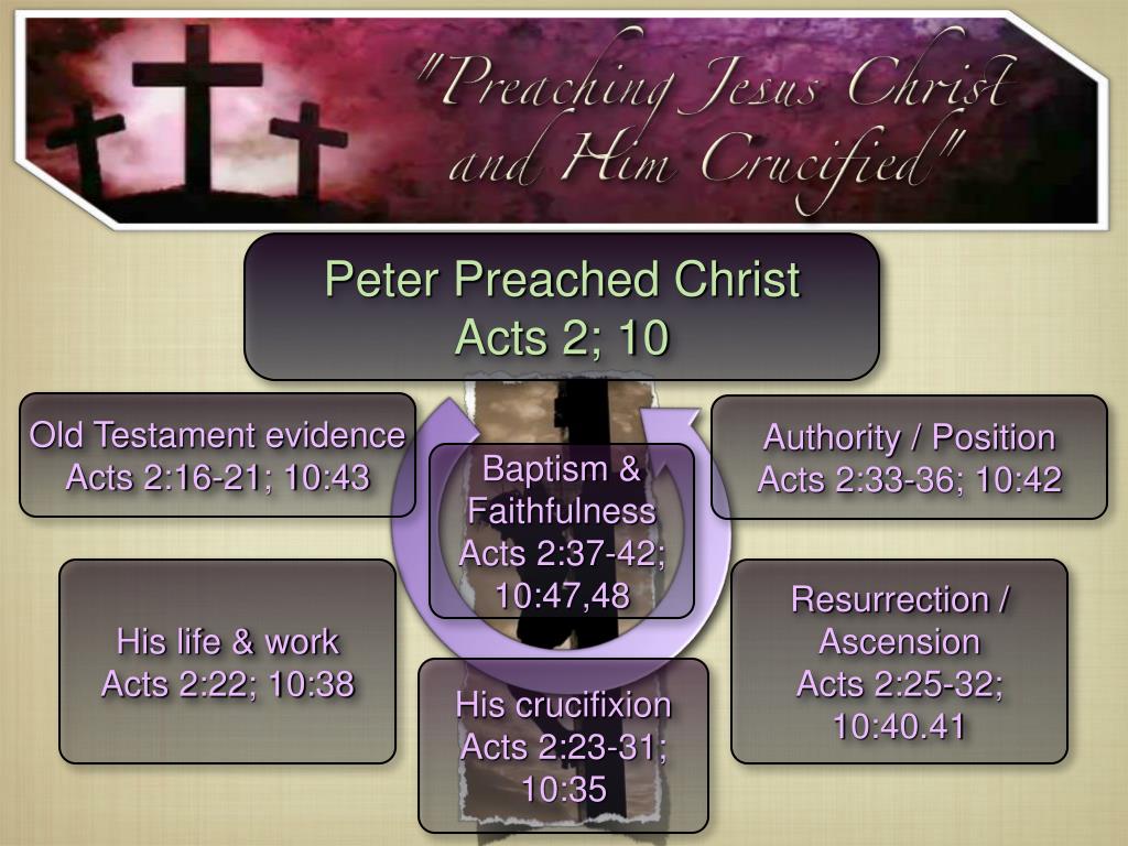 Peter Preached Christ Acts 2; 10 Old Testament evidence Acts 2:16-21; 10:43 Authority / Position Acts 2:33-36; 10:42 Baptism & Faithfulness Acts 2:37-42; 10:47,48 His life & work Acts 2:22; 10:38 Resurrection / Ascension Acts 2:25-32; 10:40.41 His crucifixion Acts 2:23-31; 10:35