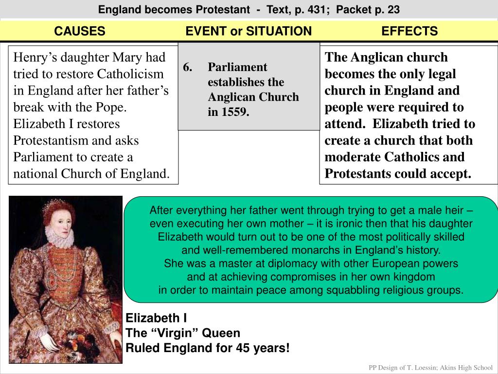 England becomes Protestant - Text, p. 431; Packet p. 23 • CAUSES EVENT or SITUATION EFFECTS 6. Parliament establishes the Anglican Church in 1559. Henry’s daughter Mary had tried to restore Catholicism in England after her father’s break with the Pope. Elizabeth I restores Protestantism and asks Parliament to create a national Church of England. The Anglican church becomes the only legal church in England and people were required to attend. Elizabeth tried to create a church that both moderate Catholics and Protestants could accept. After everything her father went through trying to get a male heir – even executing her own mother – it is ironic then that his daughter Elizabeth would turn out to be one of the most politically skilled and well-remembered monarchs in England’s history. She was a master at diplomacy with other European powers and at achieving compromises in her own kingdom in order to maintain peace among squabbling religious groups. Elizabeth I The “Virgin” Queen Ruled England for 45 years! PP Design of T. Loessin; Akins High School