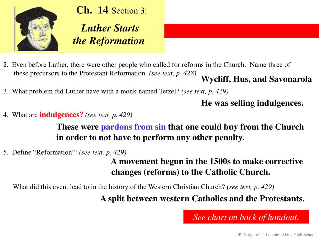 Ch. 14Section 3: Luther Starts the Reformation 2. Even before Luther, there were other people who called for reforms in the Church. Name three of these precursors to the Protestant Reformation. (see text, p. 428) Wycliff, Hus, and Savonarola 3. What problem did Luther have with a monk named Tetzel? (see text, p. 429) He was selling indulgences. 4. What are indulgences?(see text, p. 429) These were pardons from sin that one could buy from the Church in order to not have to perform any other penalty. 5. Define “Reformation”: (see text, p. 429) A movement begun in the 1500s to make corrective changes (reforms) to the Catholic Church. What did this event lead to in the history of the Western Christian Church? (see text, p. 429) A split between western Catholics and the Protestants. See chart on back of handout. PP Design of T. Loessin; Akins High School