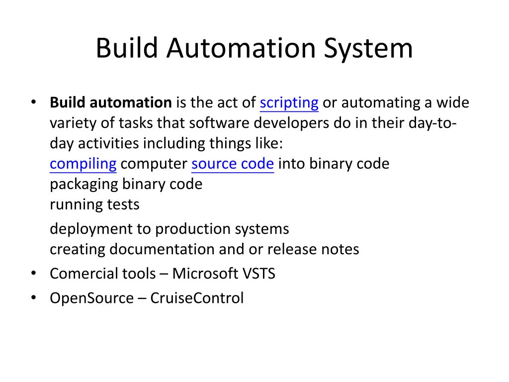 Build Automation System • Build automation is the act of scripting or automating a wide variety of tasks that software developers do in their day-to-day activities including things like: compiling computer source code into binary code packaging binary code running tests deployment to production systems creating documentation and or release notes • Comercial tools – Microsoft VSTS • OpenSource – CruiseControl