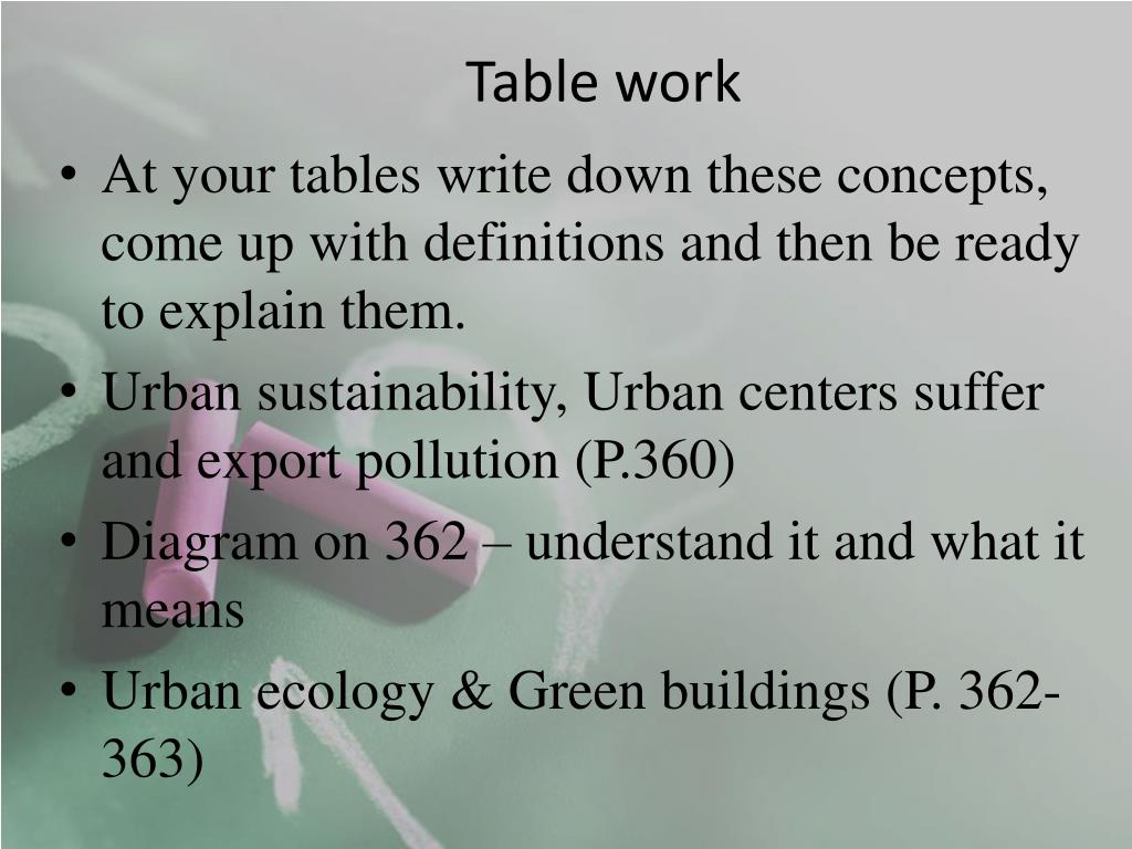 Table work • At your tables write down these concepts, come up with definitions and then be ready to explain them. • Urban sustainability, Urban centers suffer and export pollution (P.360) • Diagram on 362 – understand it and what it means • Urban ecology & Green buildings (P. 362-363)
