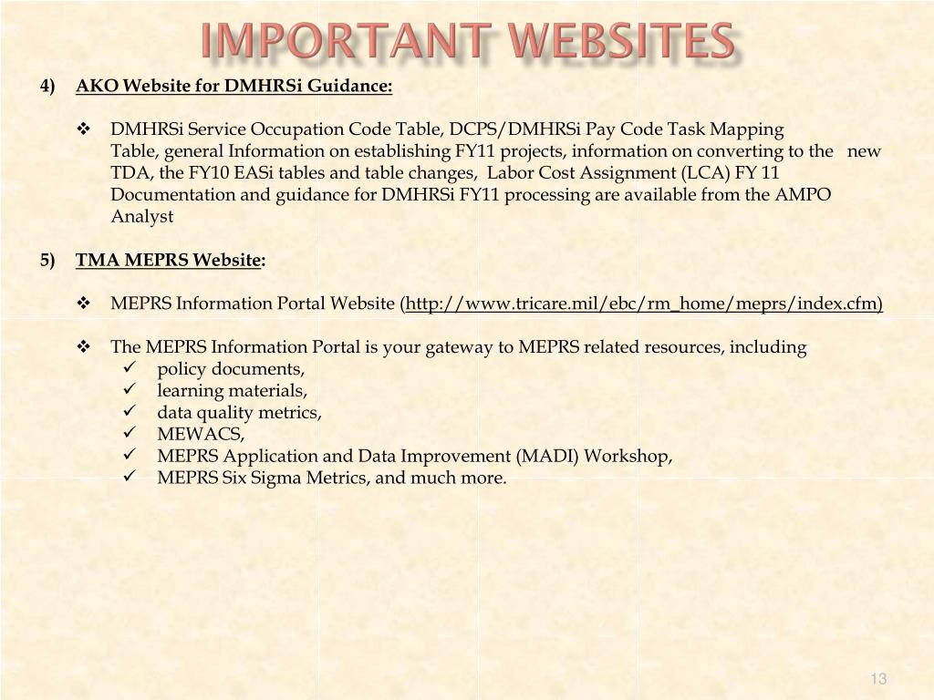 IMPORTANT WEBSITES • AKO Website for DMHRSi Guidance: • DMHRSi Service Occupation Code Table, DCPS/DMHRSi Pay Code Task Mapping • Table, general Information on establishing FY11 projects, information on converting to the new TDA, the FY10 EASi tables and table changes, Labor Cost Assignment (LCA) FY 11 Documentation and guidance for DMHRSi FY11 processing are available from the AMPO Analyst • TMA MEPRS Website: • MEPRS Information Portal Website (http://www.tricare.mil/ebc/rm_home/meprs/index.cfm) • The MEPRS Information Portal is your gateway to MEPRS related resources, including • policy documents, • learning materials, • data quality metrics, • MEWACS, • MEPRS Application and Data Improvement (MADI) Workshop, • MEPRS Six Sigma Metrics, and much more.