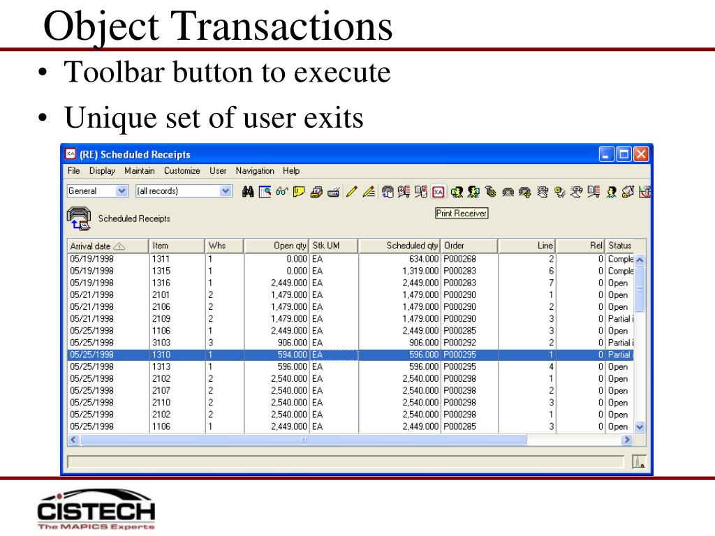Object Transactions • Toolbar button to execute • Unique set of user exits