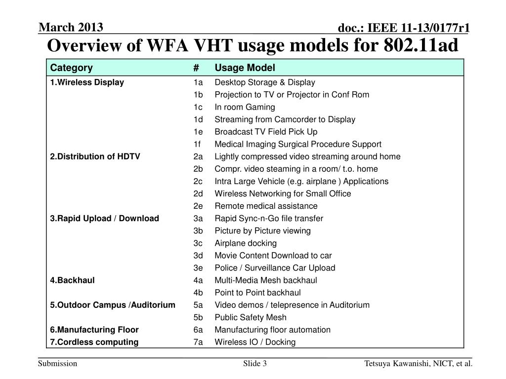 Tetsuya Kawanishi, NICT, et al. Overview of WFA VHT usage models for 802.11ad