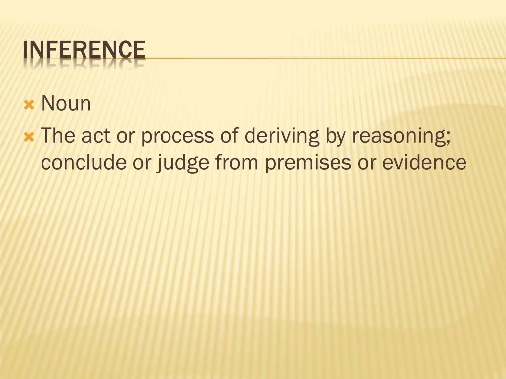Noun The act or process of deriving by reasoning; conclude or judge from premises or evidence Inference