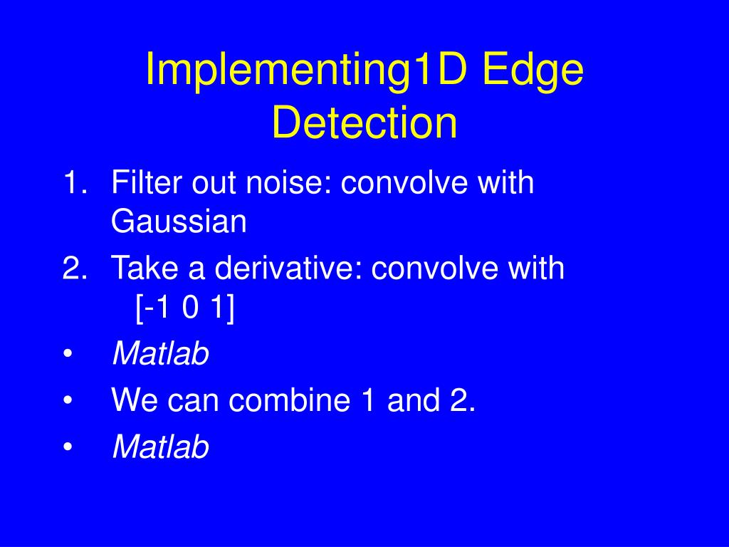 Implementing1D Edge Detection • Filter out noise: convolve with Gaussian • Take a derivative: convolve with [-1 0 1] • Matlab • We can combine 1 and 2. • Matlab