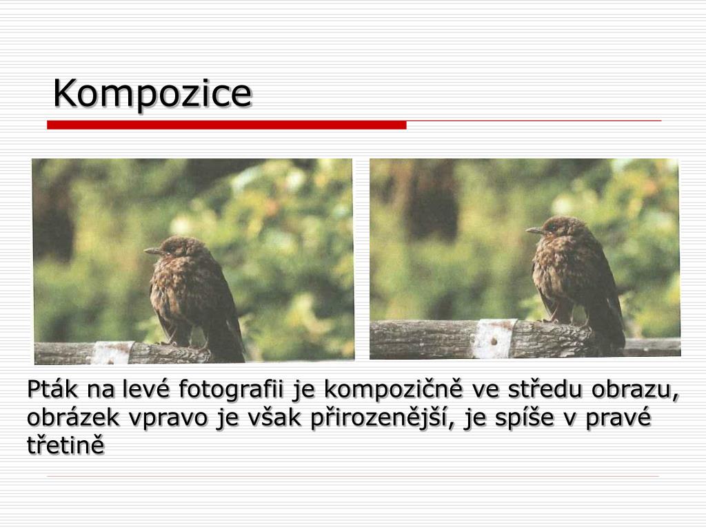 Kompozice Pták nalevé fotografii je kompozičně ve středu obrazu, obrázek vpravo je však přirozenější, je spíše v pravé třetině