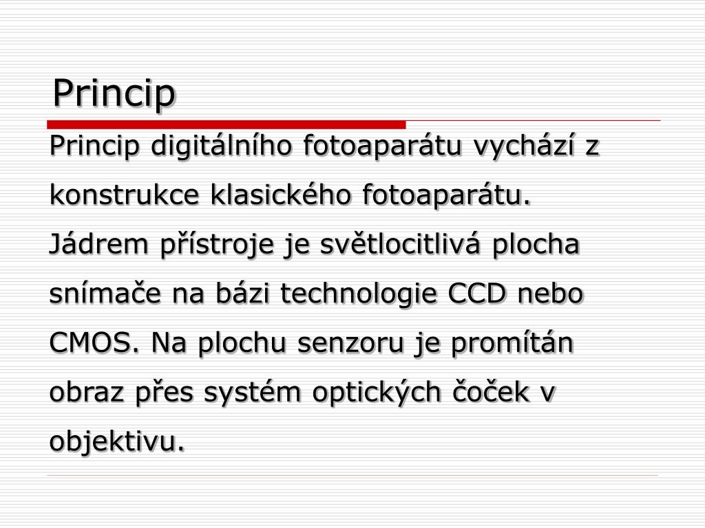 Princip Princip digitálního fotoaparátu vychází z konstrukce klasického fotoaparátu. Jádrem přístroje je světlocitlivá plocha snímače na bázi technologie CCD nebo CMOS. Na plochu senzoru je promítán obraz přes systém optických čoček v objektivu.