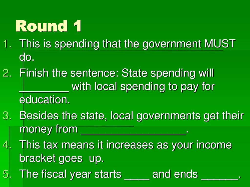 Round 1 • This is spending that the government MUST do. • Finish the sentence: State spending will ________ with local spending to pay for education. • Besides the state, local governments get their money from _________________. • This tax means it increases as your income bracket goes up. • The fiscal year starts ____ and ends ______.