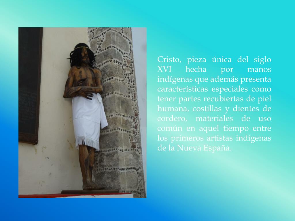 Cristo, pieza única del siglo XVI hecha por manos indígenas que además presenta características especiales como tener partes recubiertas de piel humana, costillas y dientes de cordero, materiales de uso común en aquel tiempo entre los primeros artistas indígenas de la Nueva España.