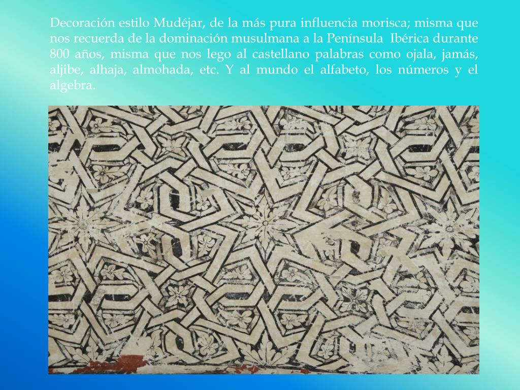 Decoración estilo Mudéjar, de la más pura influencia morisca; misma que nos recuerda de la dominación musulmana a la Península Ibérica durante 800 años, misma que nos lego al castellano palabras como ojala, jamás, aljibe, alhaja, almohada, etc. Y al mundo el alfabeto, los números y el algebra.