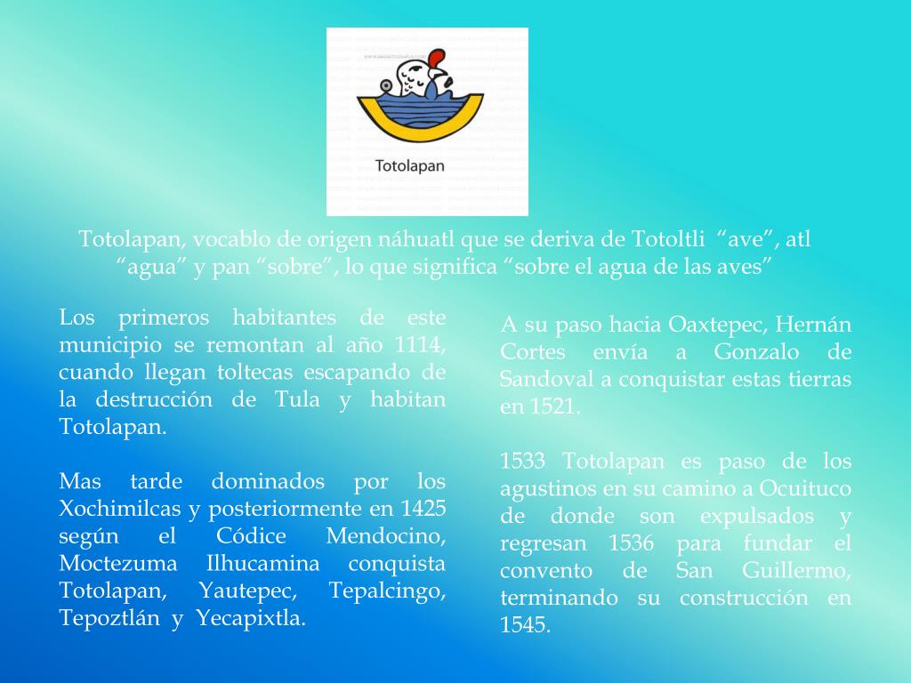 Totolapan, vocablo de origen náhuatl que se deriva de Totoltli “ave”, atl “agua” y pan “sobre”, lo que significa “sobre el agua de las aves” Los primeros habitantes de este municipio se remontan al año 1114, cuando llegan toltecas escapando de la destrucción de Tula y habitan Totolapan. Mas tarde dominados por los Xochimilcas y posteriormente en 1425 según el Códice Mendocino, Moctezuma Ilhucamina conquista Totolapan, Yautepec, Tepalcingo, Tepoztlán y Yecapixtla. A su paso hacia Oaxtepec, Hernán Cortes envía a Gonzalo de Sandoval a conquistar estas tierras en 1521. 1533 Totolapan es paso de los agustinos en su camino a Ocuituco de donde son expulsados y regresan 1536 para fundar el convento de San Guillermo, terminando su construcción en 1545.