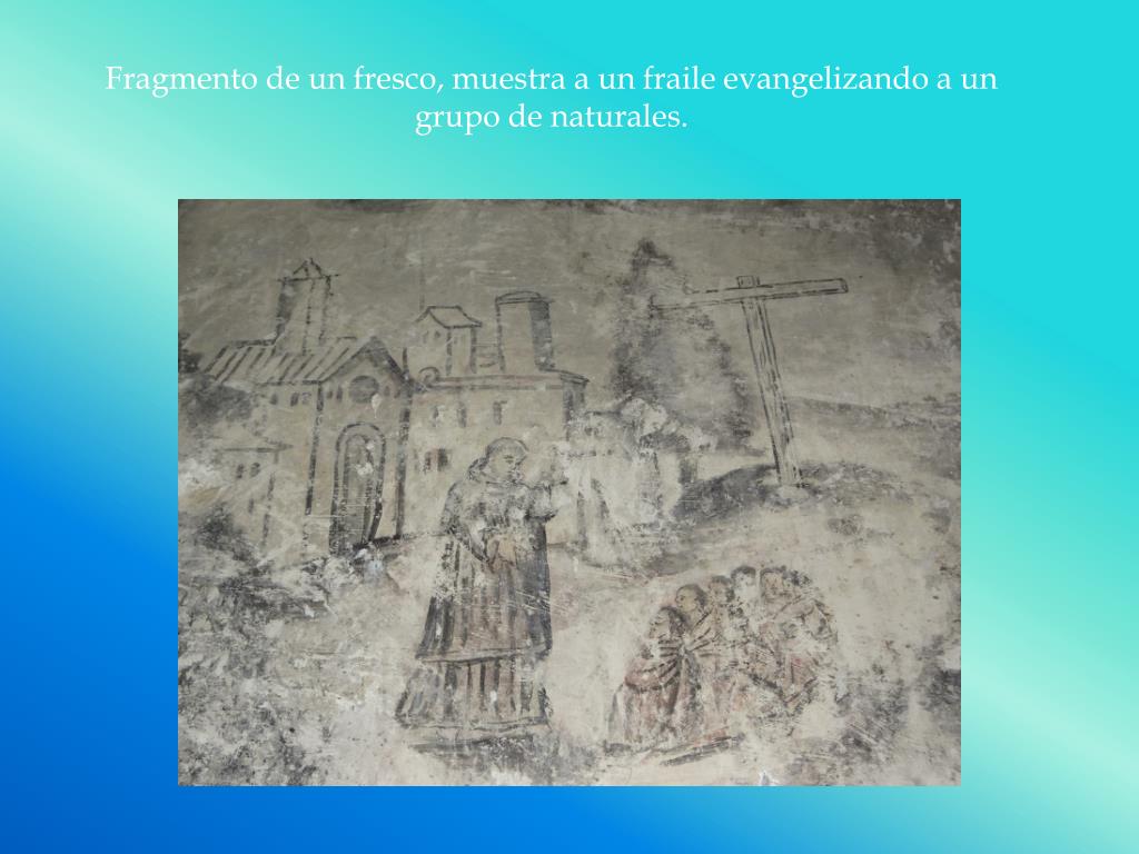 Fragmento de un fresco, muestra a un fraile evangelizando a un grupo de naturales.