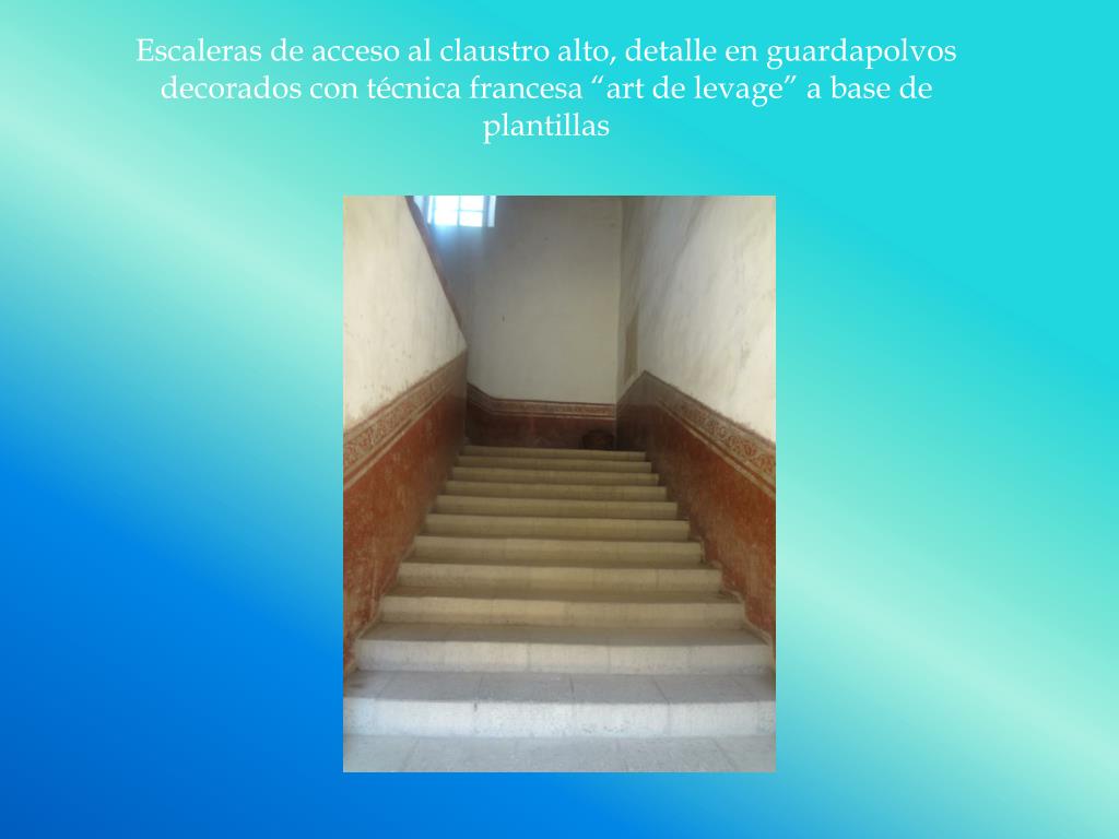 Escaleras de acceso al claustro alto, detalle en guardapolvos decorados con técnica francesa “art de levage” a base de plantillas