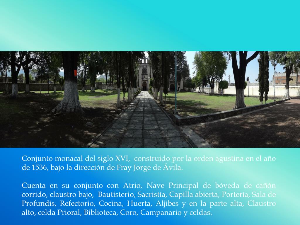 Conjunto monacal del siglo XVI, construido por la orden agustina en el año de 1536, bajo la dirección de Fray Jorge de Ávila. Cuenta en su conjunto con Atrio, Nave Principal de bóveda de cañón corrido, claustro bajo, Bautisterio, Sacristía, Capilla abierta, Portería, Sala de Profundis, Refectorio, Cocina, Huerta, Aljibes y en la parte alta, Claustro alto, celda Prioral, Biblioteca, Coro, Campanario y celdas.