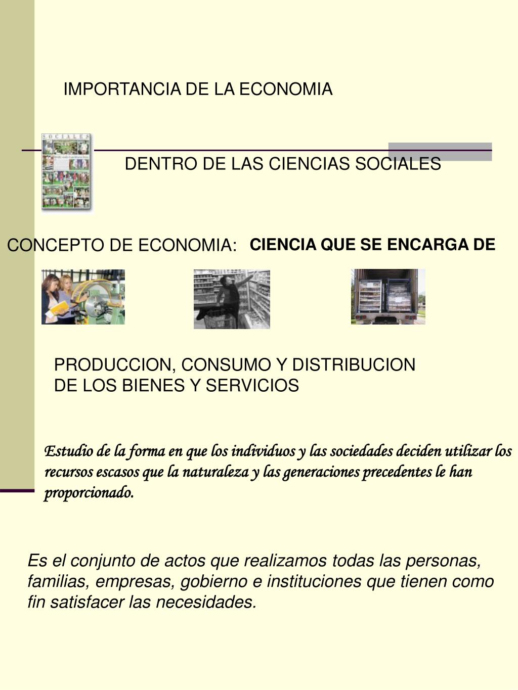IMPORTANCIA DE LA ECONOMIA. DENTRO DE LAS CIENCIAS SOCIALES. CONCEPTO DE ECONOMIA:. CIENCIA QUE SE ENCARGA DE . PRODUCCION, CONSUMO Y DISTRIBUCION DE LOS BIENES Y SERVICIOS. Estudio de la forma en que los individuos y las sociedades deciden utilizar los