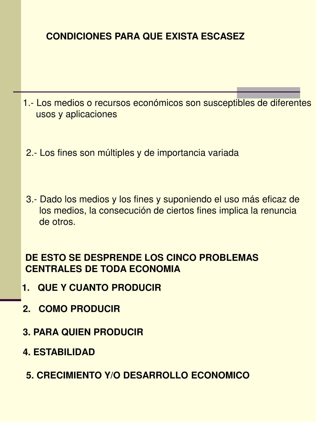 CONDICIONES PARA QUE EXISTA ESCASEZ 1.- Los medios o recursos económicos son susceptibles de diferentes usos y aplicaciones 2.- Los fines son múltiples y de importancia variada 3.- Dado los medios y los fines y suponiendo el uso más eficaz de los medios, la consecución de ciertos fines implica la renuncia de otros. DE ESTO SE DESPRENDE LOS CINCO PROBLEMAS CENTRALES DE TODA ECONOMIA • QUE Y CUANTO PRODUCIR 2. COMO PRODUCIR 3. PARA QUIEN PRODUCIR 4. ESTABILIDAD 5. CRECIMIENTO Y/O DESARROLLO ECONOMICO