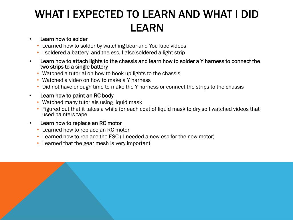 What I expected to learn and what I did learn • Learn how to solder • Learned how to solder by watching bear and YouTube videos • I soldered a battery, and the esc, I also soldered a light strip • Learn how to attach lights to the chassis and learn how to solder a Y harness to connect the two strips to a single battery • Watched a tutorial on how to hook up lights to the chassis • Watched a video on how to make a Y harness • Did not have enough time to make the Y harness or connect the strips to the chassis • Learn how to paint an RC body • Watched many tutorials using liquid mask • Figured out that it takes a while for each coat of liquid mask to dry so I watched videos that used painters tape • Learn how to replace an RC motor • Learned how to replace an RC motor • Learned how to replace the ESC ( I needed a new esc for the new motor) • Learned that the gear mesh is very important
