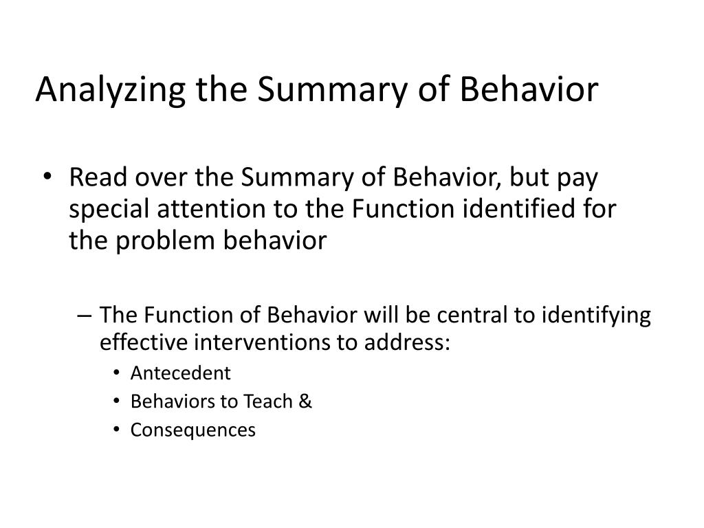 Analyzing the Summary of Behavior • Read over the Summary of Behavior, but pay special attention to the Function identified for the problem behavior • The Function of Behavior will be central to identifying effective interventions to address: • Antecedent • Behaviors to Teach & • Consequences