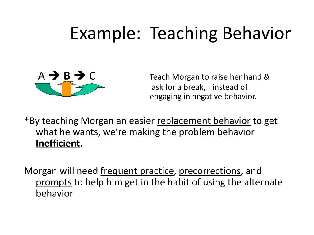 Example: Teaching Behavior A B C Teach Morgan to raise her hand & ask for a break, instead of engaging in negative behavior. *By teaching Morgan an easier replacement behavior to get what he wants, we’re making the problem behavior Inefficient. Morgan will need frequent practice, precorrections, and prompts to help him get in the habit of using the alternate behavior