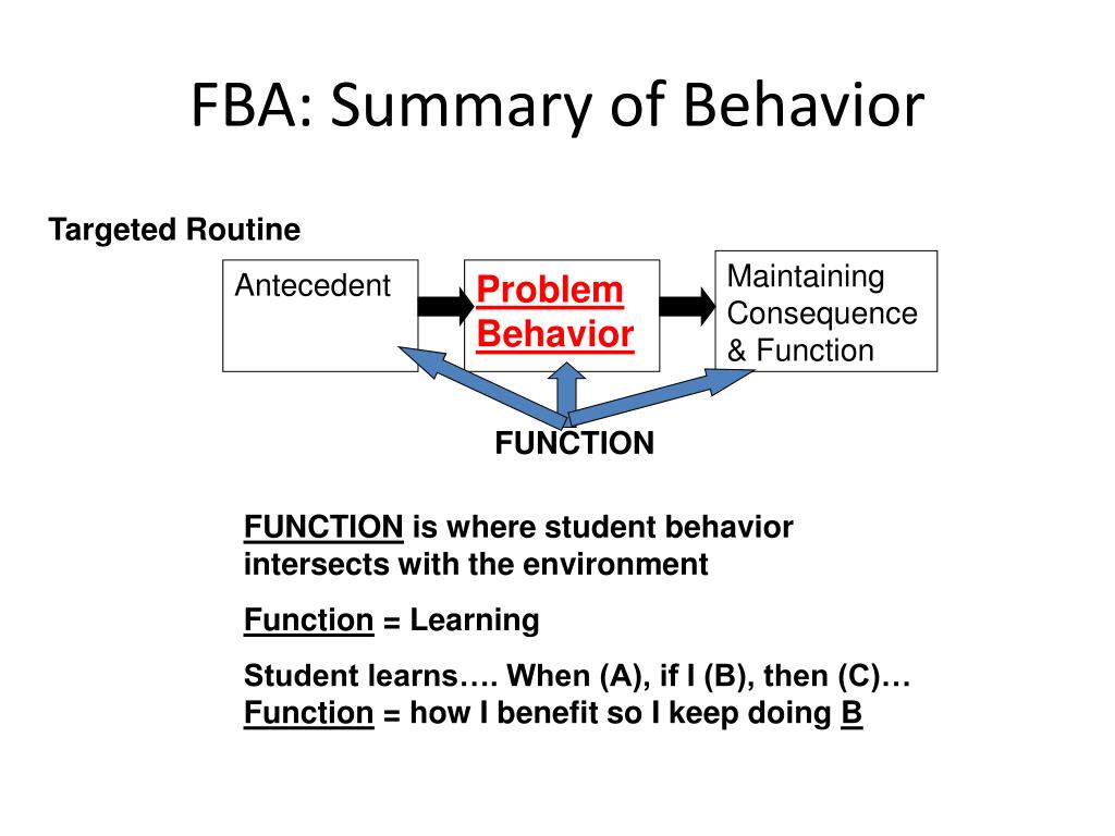 FBA: Summary of Behavior Targeted Routine Maintaining Consequence & Function Antecedent Problem Behavior FUNCTION FUNCTION is where student behavior intersects with the environment Function = Learning Student learns…. When (A), if I (B), then (C)… Function = how I benefit so I keep doing B