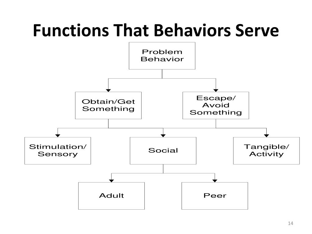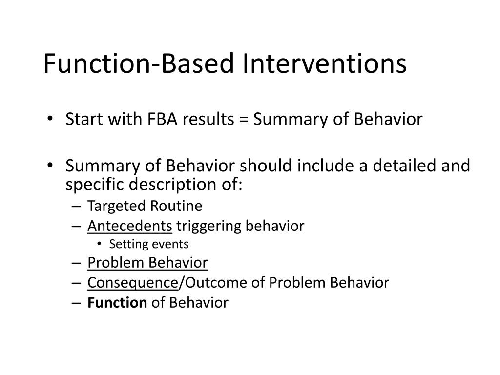 Function-Based Interventions Start with FBA results = Summary of Behavior Summary of Behavior should include a detailed and specific description of: Targeted Routine Antecedents triggering behavior Setting events Problem Behavior Consequence/Outcome of Problem Behavior Function of Behavior
