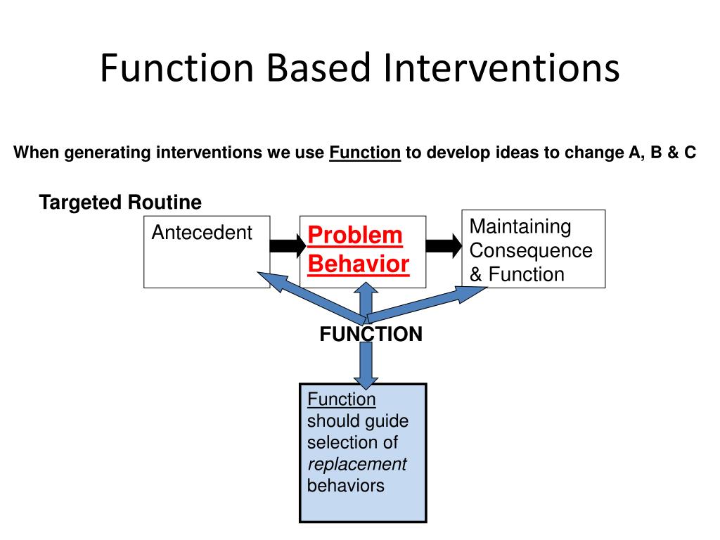 Function Based Interventions When generating interventions we use Function to develop ideas to change A, B & C Targeted Routine Maintaining Consequence & Function Antecedent Problem Behavior FUNCTION Function should guide selection of replacement behaviors