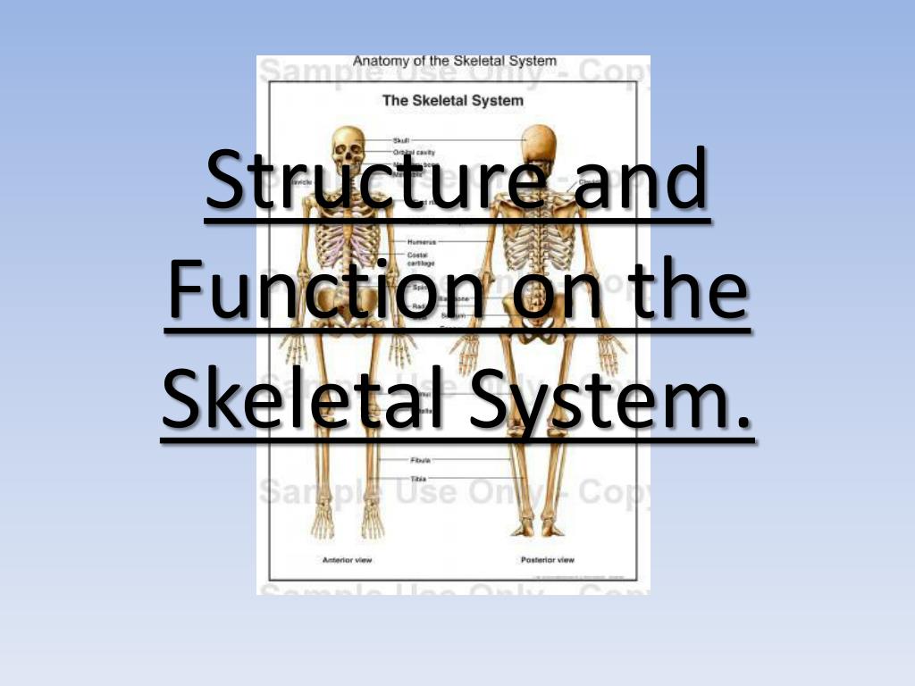 Structure and Function on the Skeletal System. Structure of the Skeleton. We know that the 206 bones of the skeleton are split into two different groups… The Axial Skeleton – 80 bones. The Appendicular skeleton – 126 bones. Consists of: Skull The vertebrae The sternum The ribs.