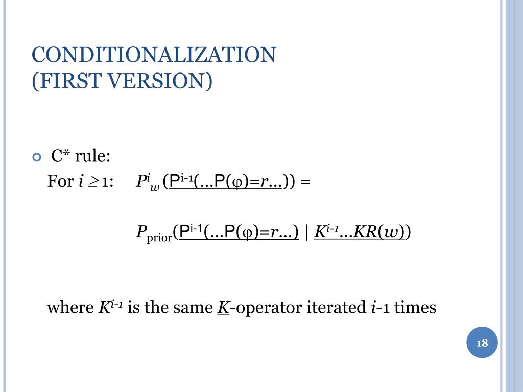 CONDITIONALIZATION (FIRST VERSION) • C* rule: Fori 1: Piw(Pi-1(…P()=r...)) = Pprior(Pi-1(…P()=r…) | Ki-1...KR(w)) whereKi-1isthesameK-operatoriteratedi-1 times