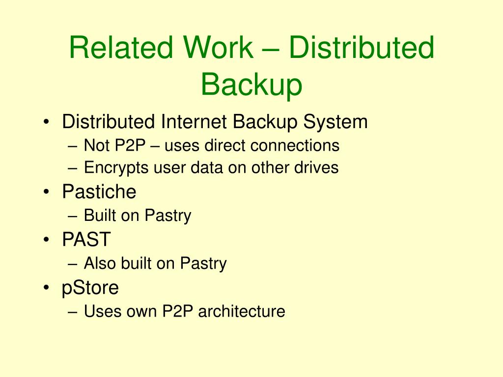 Related Work – Distributed Backup • Distributed Internet Backup System • Not P2P – uses direct connections • Encrypts user data on other drives • Pastiche • Built on Pastry • PAST • Also built on Pastry • pStore • Uses own P2P architecture