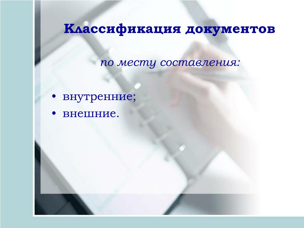 Классификация документов по месту составления: • внутренние; • внешние.