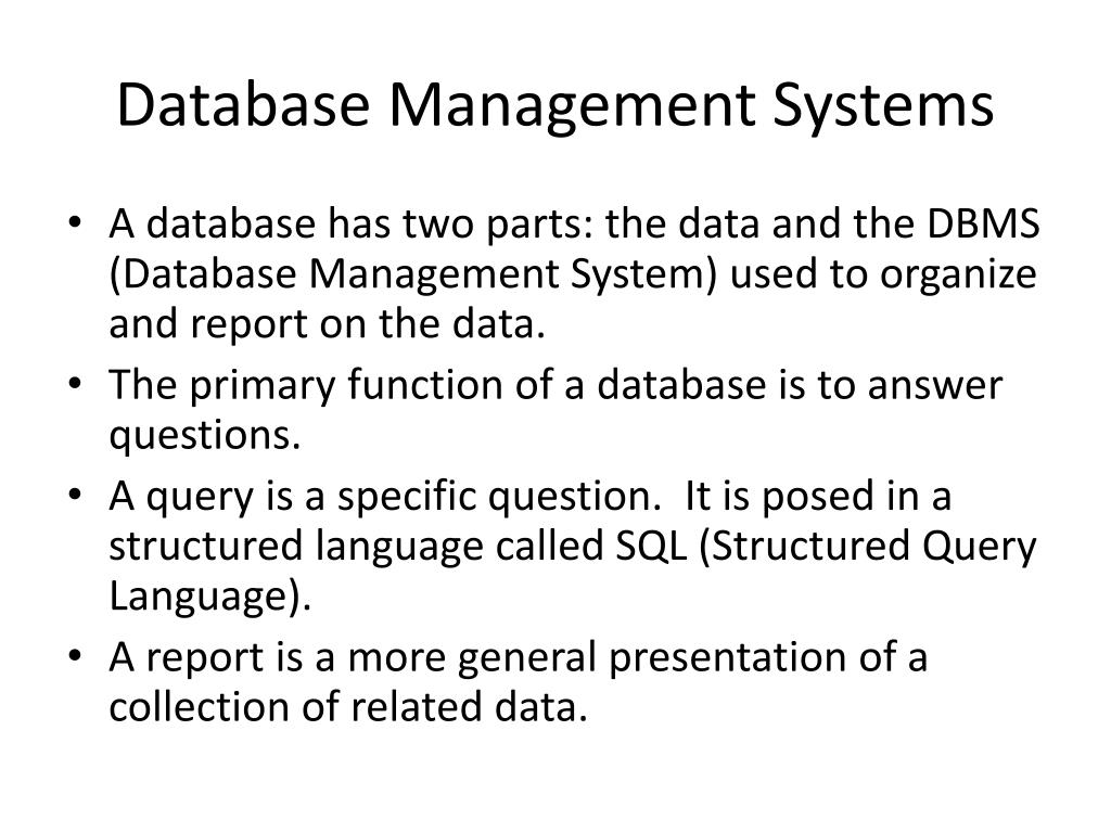 Database Management Systems • A database has two parts: the data and the DBMS (Database Management System) used to organize and report on the data. • The primary function of a database is to answer questions. • A query is a specific question. It is posed in a structured language called SQL (Structured Query Language). • A report is a more general presentation of a collection of related data.