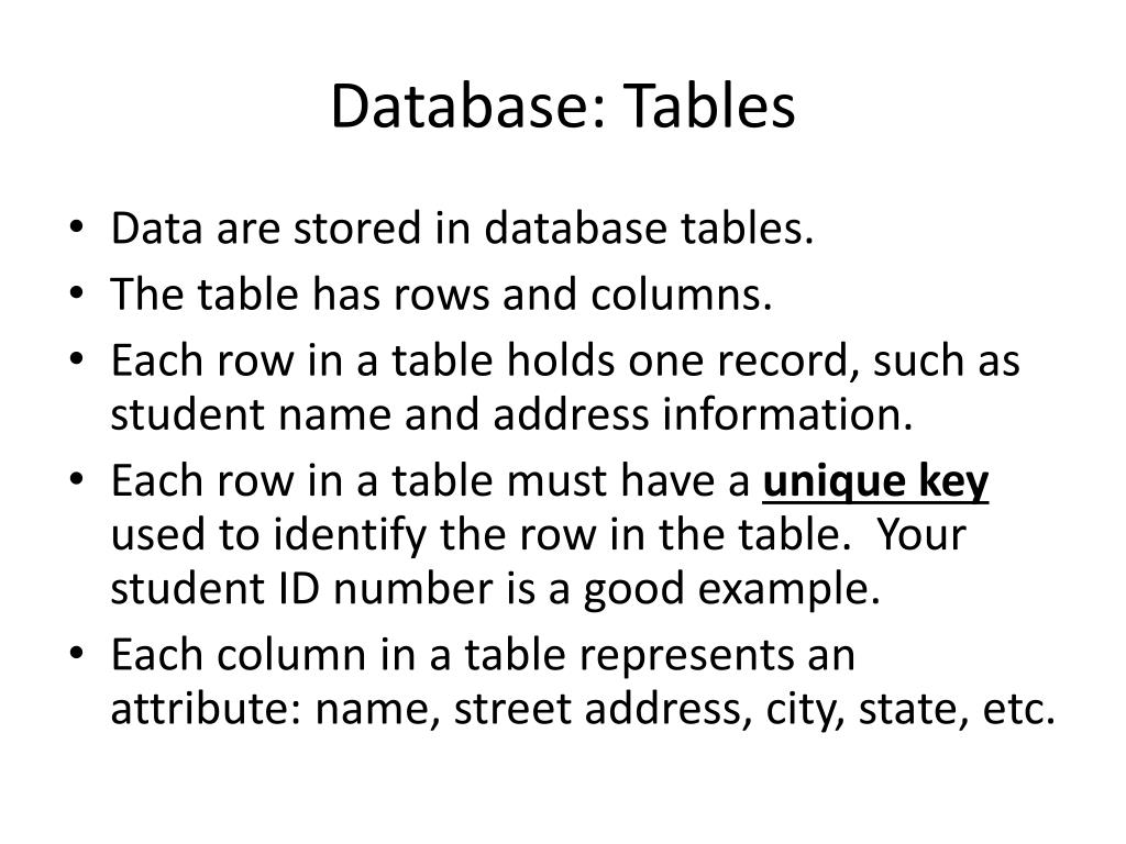 Database: Tables • Data are stored in database tables. • The table has rows and columns. • Each row in a table holds one record, such as student name and address information. • Each row in a table must have a unique key used to identify the row in the table. Your student ID number is a good example. • Each column in a table represents an attribute: name, street address, city, state, etc.