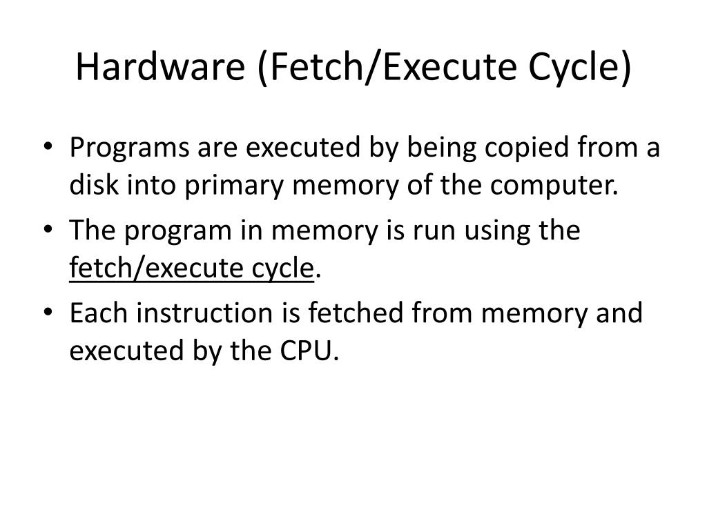 Hardware (Fetch/Execute Cycle) • Programs are executed by being copied from a disk into primary memory of the computer. • The program in memory is run using the fetch/execute cycle. • Each instruction is fetched from memory and executed by the CPU.