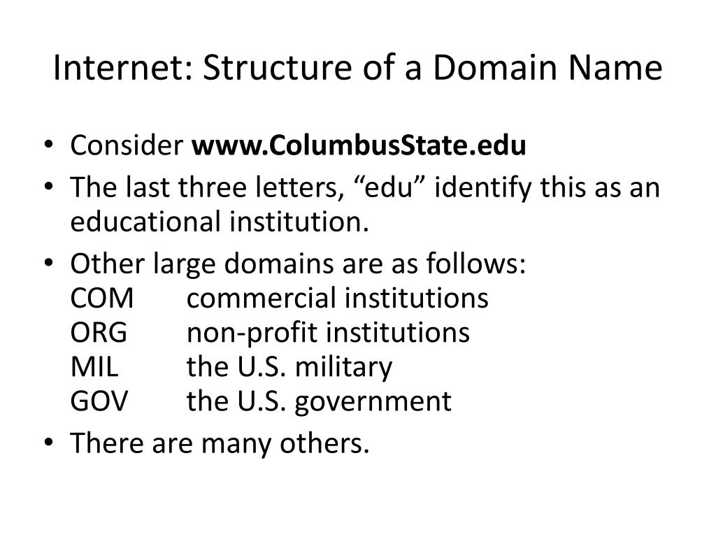 Internet: Structure of a Domain Name • Consider www.ColumbusState.edu • The last three letters, “edu” identify this as an educational institution. • Other large domains are as follows:COM commercial institutionsORG non-profit institutionsMIL the U.S. militaryGOV the U.S. government • There are many others.