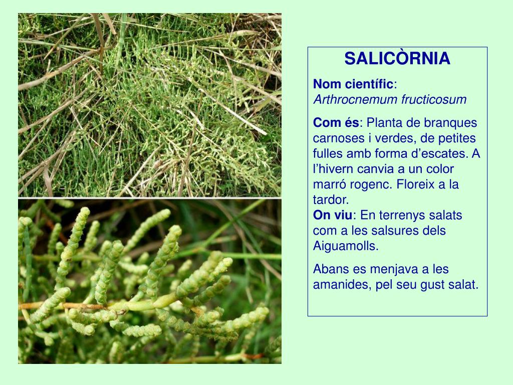 SALICÒRNIA Nom científic: Arthrocnemum fructicosum Com és: Planta de branques carnoses i verdes, de petites fulles amb forma d’escates. A l’hivern canvia a un color marró rogenc. Floreix a la tardor. On viu:En terrenys salats com a les salsures dels Aiguamolls. Abans es menjava a les amanides, pel seu gust salat.