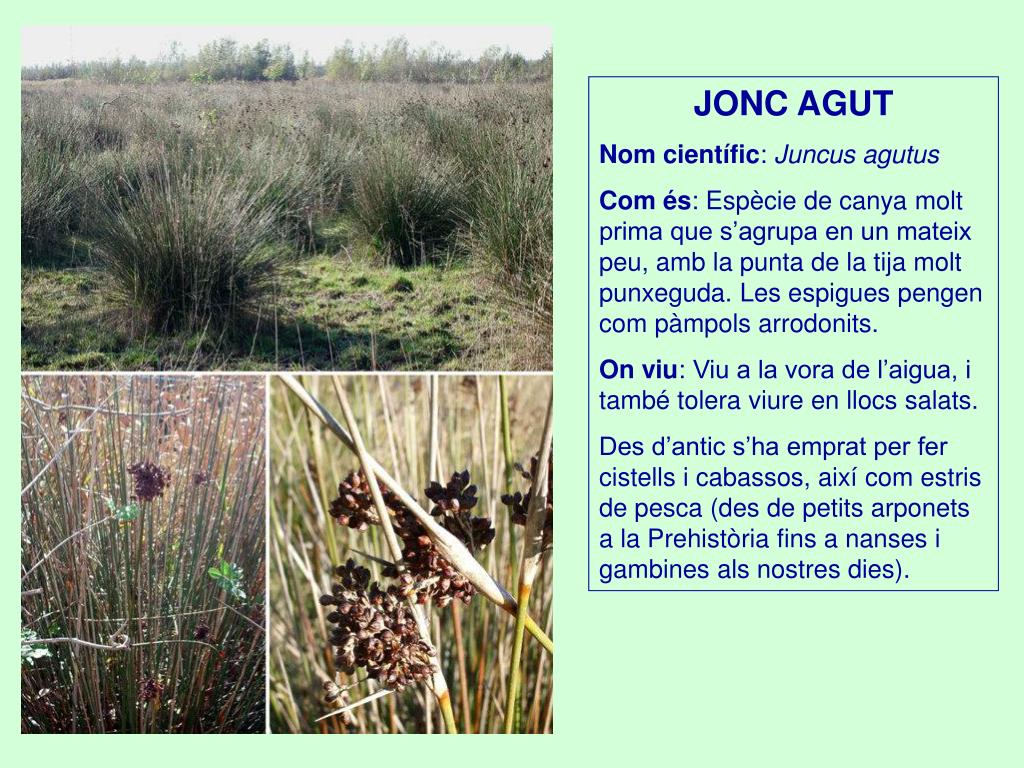 JONC AGUT Nom científic: Juncus agutus Com és: Espècie de canya molt prima que s’agrupa en un mateix peu, amb la punta de la tija molt punxeguda. Les espigues pengen com pàmpols arrodonits. On viu: Viu a la vora de l’aigua, i també tolera viure en llocs salats. Des d’antic s’ha emprat per fer cistells i cabassos, així com estris de pesca (des de petits arponets a la Prehistòria fins a nanses i gambines als nostres dies).