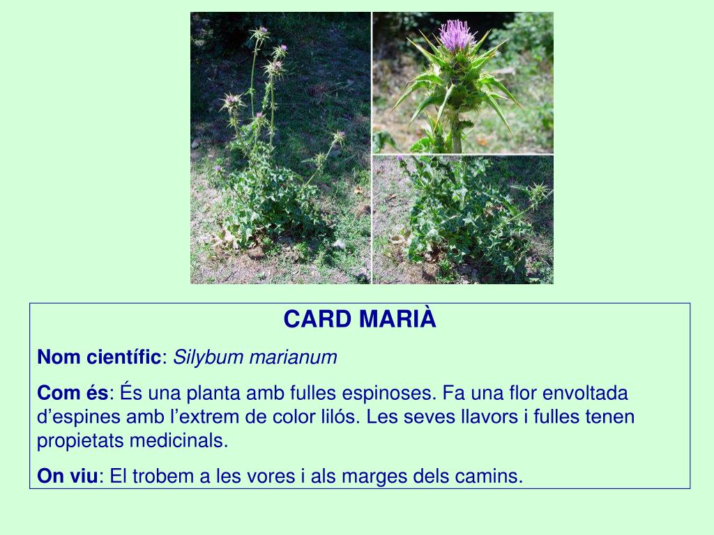 CARD MARIÀ Nom científic: Silybum marianum Com és: És una planta amb fulles espinoses. Fa una flor envoltada d’espines amb l’extrem de color lilós. Les seves llavors i fulles tenen propietats medicinals. On viu: El trobem a les vores i als marges dels camins.