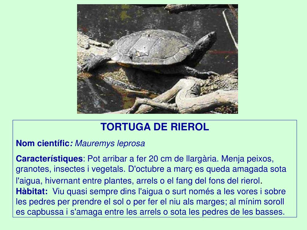 TORTUGA DE RIEROL Nom científic: Mauremys leprosa Característiques: Pot arribar a fer 20 cm de llargària. Menja peixos, granotes, insectes i vegetals. D'octubre a març es queda amagada sota l'aigua, hivernant entre plantes, arrels o el fang del fons del rierol.Hàbitat: Viu quasi sempre dins l'aigua o surt només a les vores i sobre les pedres per prendre el sol o per fer el niu als marges; al mínim soroll es capbussa i s'amaga entre les arrels o sota les pedres de les basses.