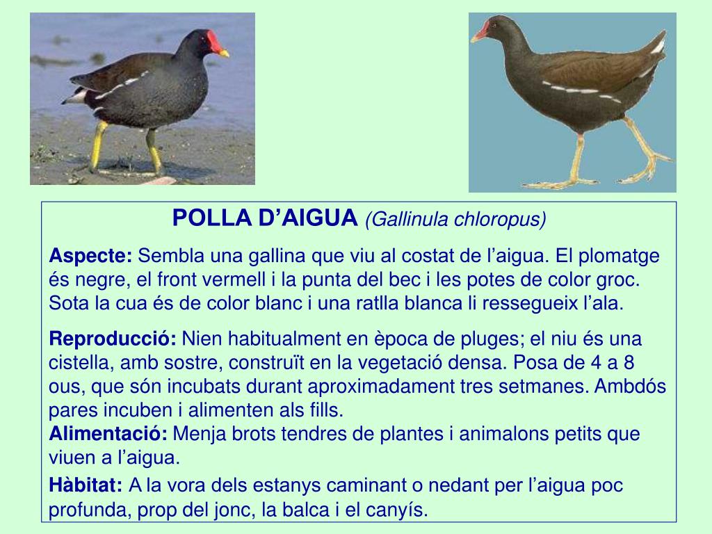 POLLA D’AIGUA (Gallinula chloropus) Aspecte: Sembla una gallina que viu al costat de l’aigua. El plomatge és negre, el front vermell i la punta del bec i les potes de color groc. Sota la cua és de color blanc i una ratlla blanca li ressegueix l’ala. Reproducció: Nien habitualment en època de pluges; el niu és una cistella, amb sostre, construït en la vegetació densa. Posa de 4 a 8 ous, que són incubats durant aproximadament tres setmanes. Ambdós pares incuben i alimenten als fills. Alimentació: Menja brots tendres de plantes i animalons petits que viuen a l’aigua. Hàbitat:A la vora dels estanys caminant o nedant per l’aigua poc profunda, prop del jonc, la balca i el canyís.