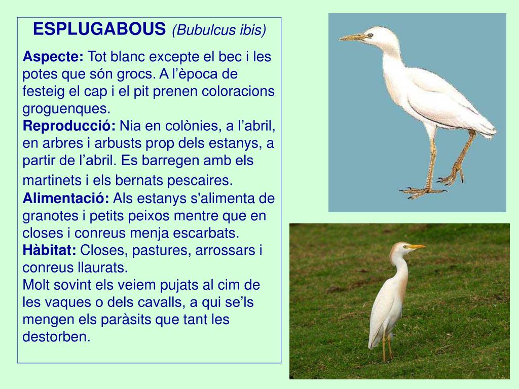 ESPLUGABOUS (Bubulcus ibis) Aspecte: Tot blanc excepte el bec i les potes que són grocs. A l’època de festeig el cap i el pit prenen coloracions groguenques. Reproducció: Nia en colònies, a l’abril, en arbres i arbusts prop dels estanys, a partir de l’abril. Es barregen amb els martinets i els bernats pescaires.Alimentació: Als estanys s'alimenta de granotes i petits peixos mentre que en closes i conreus menja escarbats. Hàbitat: Closes,pastures, arrossars i conreus llaurats. Molt sovint els veiem pujats al cim de les vaques o dels cavalls, a qui se’ls mengen els paràsits que tant les destorben.