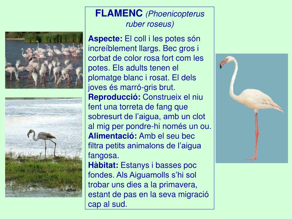 FLAMENC(Phoenicopterus ruber roseus) Aspecte: El coll i les potes són increíblement llargs. Bec gros i corbat de color rosa fort com les potes. Els adults tenen el plomatge blanc i rosat. El dels joves és marró-gris brut. Reproducció: Construeix el niu fent una torreta de fang que sobresurt de l’aigua, amb un clot al mig per pondre-hi només un ou.Alimentació: Amb el seu bec filtra petits animalons de l’aigua fangosa. Hàbitat: Estanys i basses poc fondes. Als Aiguamolls s’hi sol trobar uns dies a la primavera, estant de pas en la seva migració cap al sud.
