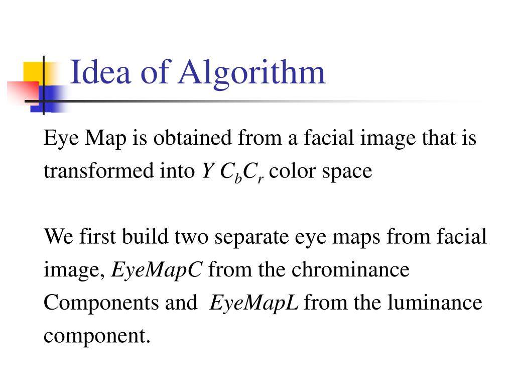 Idea of Algorithm Eye Map is obtained from a facial image that is transformed into Y CbCrcolor space We first build two separate eye maps from facial image, EyeMapC from the chrominance Components and EyeMapL from the luminance component.