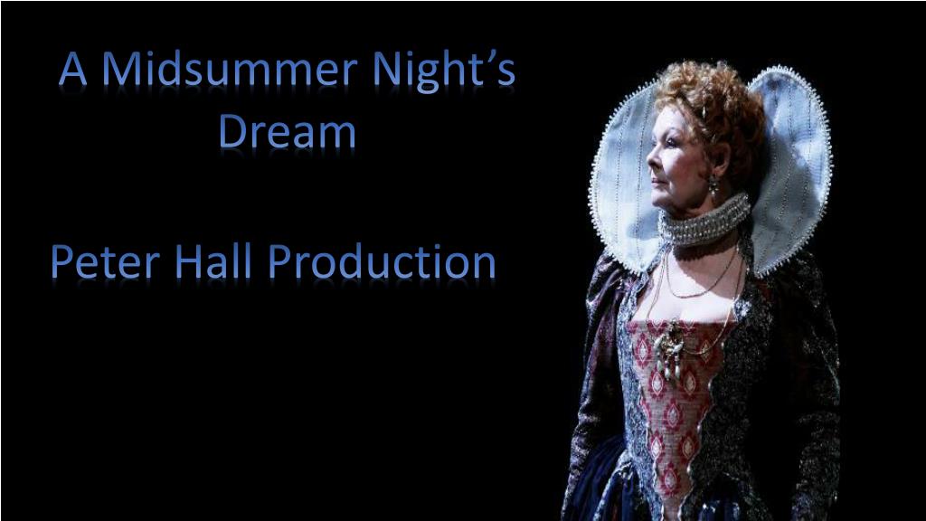 A Midsummer Night’s Dream. Peter Hall Production. About:. Set in Elizabethan England, Peter Hall’s new production sees Titania, the Fairy Queen, as a portrait of the ageing Queen Elizabeth I, fascinated with the theatre, besieged by courtiers but ‘married to the people of England’